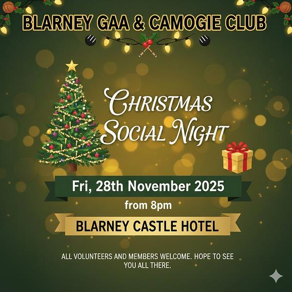 We would like to sincerely thank everyone who has helped across all sections of Blarney GAA & Camogie over the past twelve months. Your continued support, and volunteerism are vital to the running of our club and to it's future growth. To show our appreciation, we would like to invite all members, coaches and volunteers to our end of year Social Night in the Blarney Castle Hotel on Friday, November 28th at 8pm. We hope to see you all there. Thank you very much.